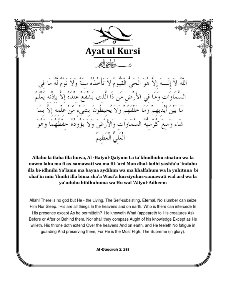 As previously mentioned Ayat al-Kursi has been named thus due to the word Kursi appearing therin. Abu Ameenah Bilal Philips you can unlock the beauty of this. Here is the full Arabic text of the verse.